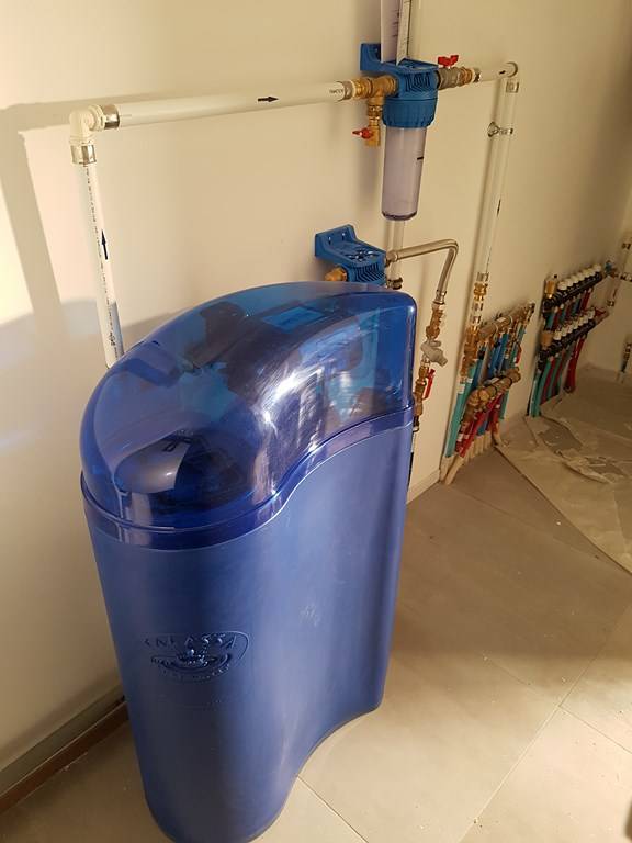 En amont de l'adoucisseur, il a été installé un filtre évitant de mettre en danger les installations de plomberie, les robinetteries et l'électroménager, mais aussi les impuretés pour le frigo américain (avant adoucisseur).