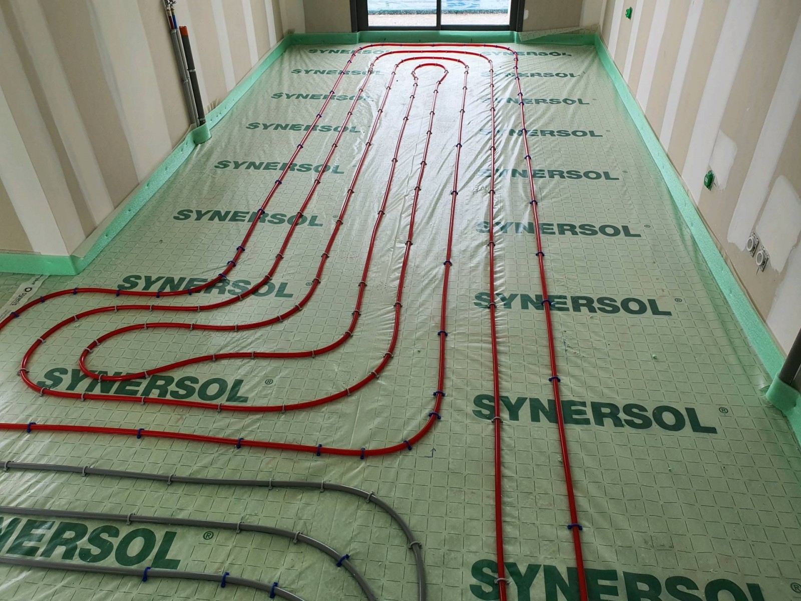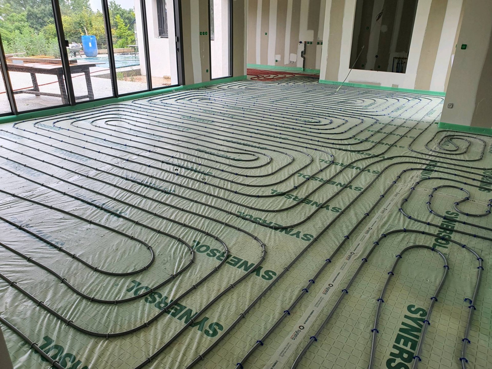 Ce plancher chauffant à eau basse température réalisé sur la commune de Villette D' Anthon à été installé sur un ravoirage en mousse PU (polyuréthane) projeté au sol dans le but de recouvrir les réseaux au sol d' eau et électricité et d' isoler le plancher béton en respectant la RT2012.