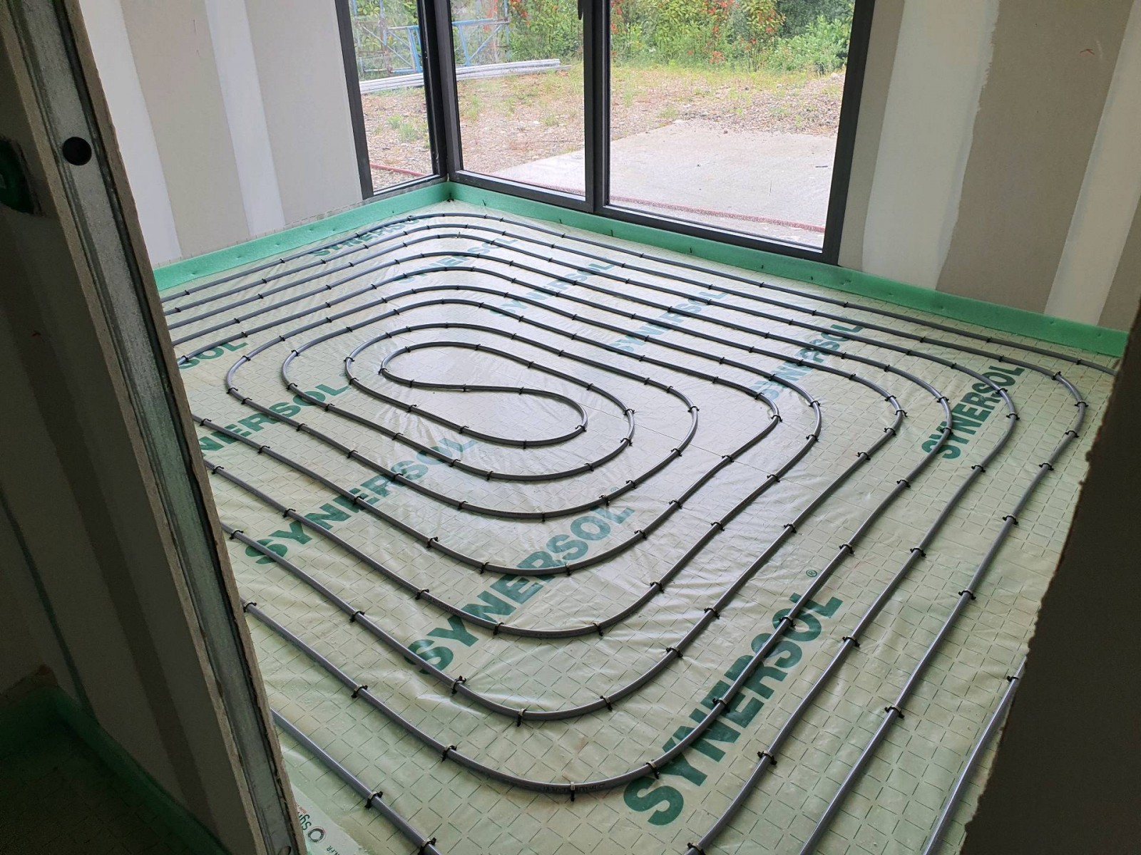 un chauffage par le sol ou plancher chauffant qui sera chauffé plus tard dans l avancement des travaux par une