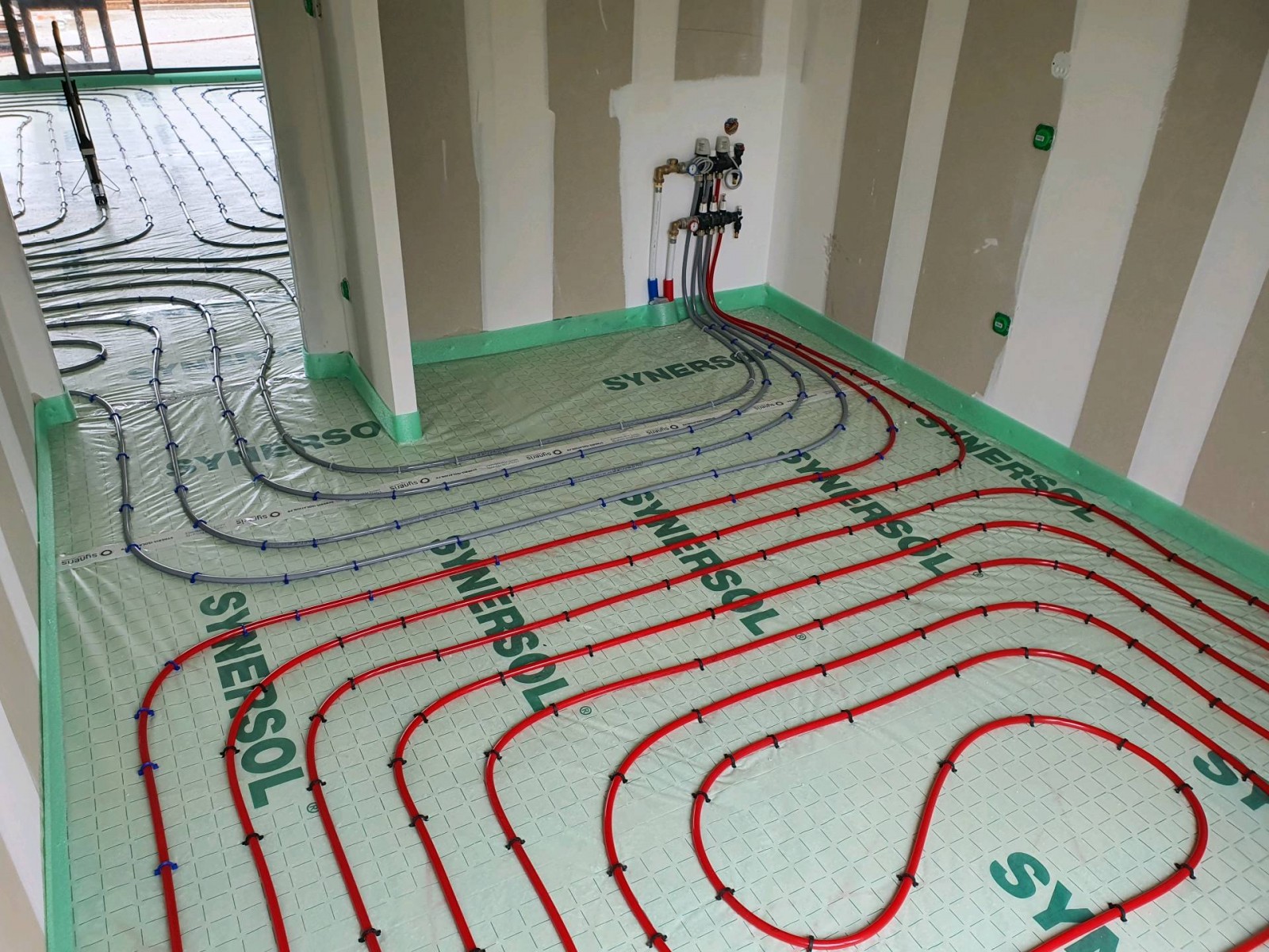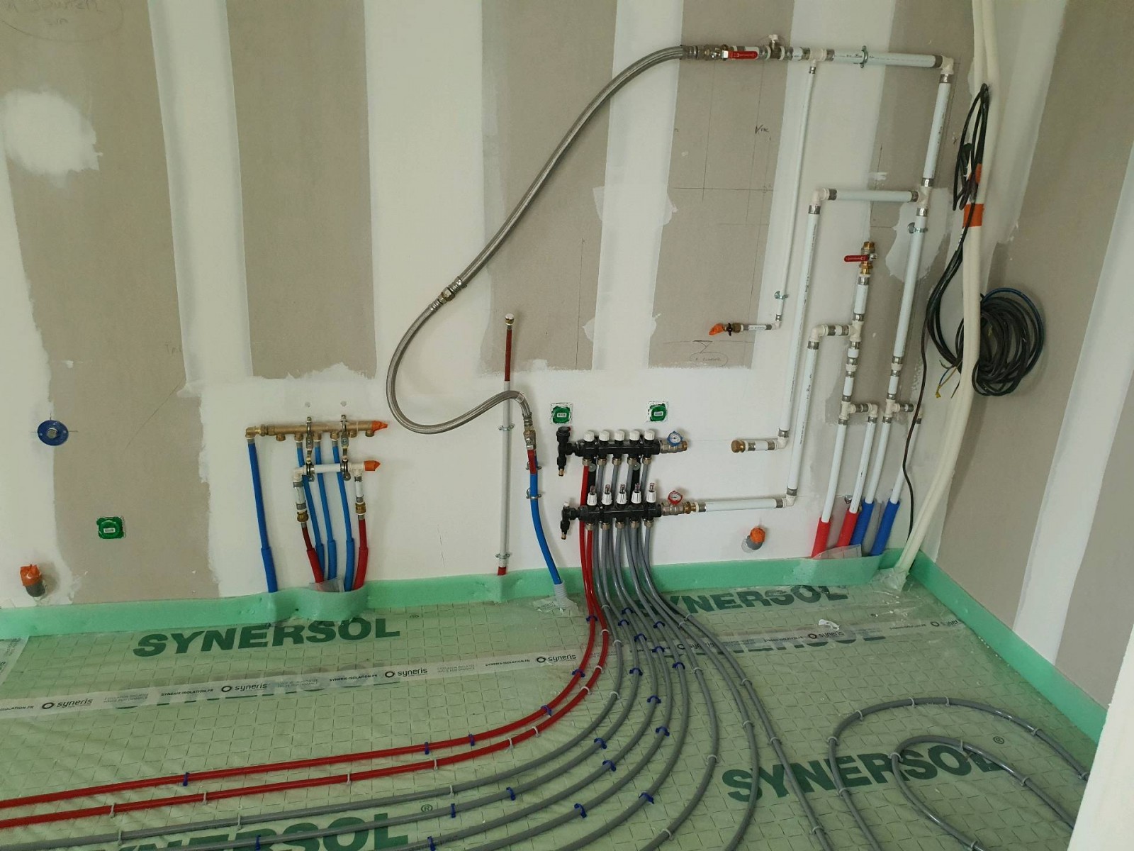RBM, 2 collecteurs en composite, tube barrière anti oxygène, alimentations en tubes multicouches Pb Tube diamètre 26 et 32, gestions individuelles pour les chambres avec micro moteurs gérés par des thermostats pour chaque pièce.