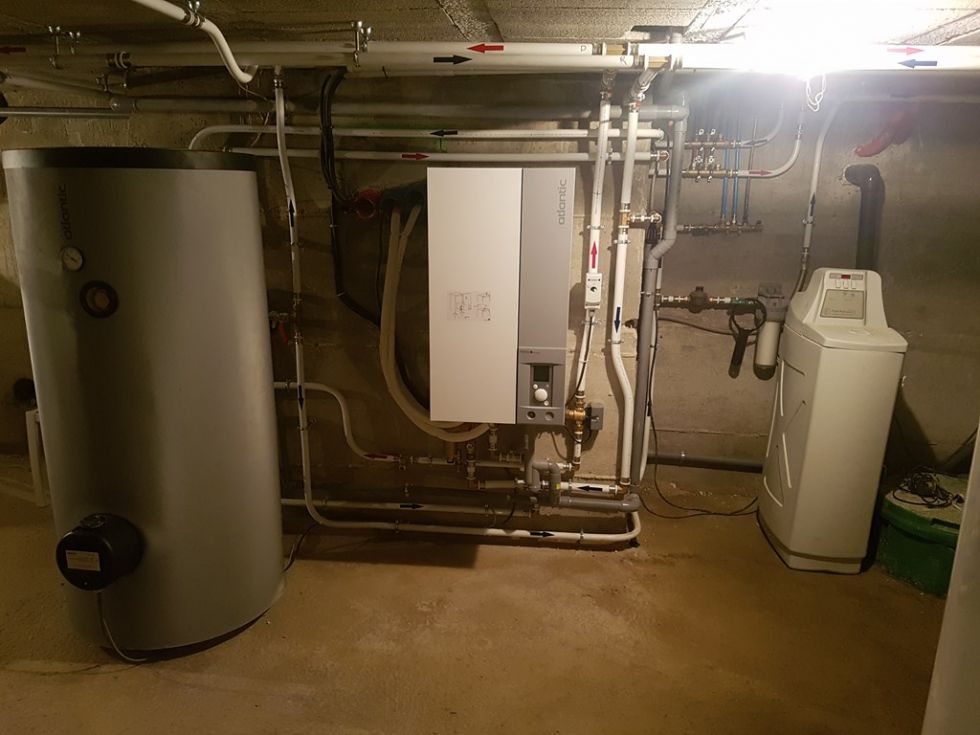 Installation d'une pompe à chaleur air eau Atlantic pas cher sur ce chantier situé à Bourgoin Jallieu en Isère, avec également la pose d'un ballon d'eau chaude sanitaire Atlantic 300 L couplé à la PAC et appoint électrique intégré gèré par la PAC pour le complément de température.
